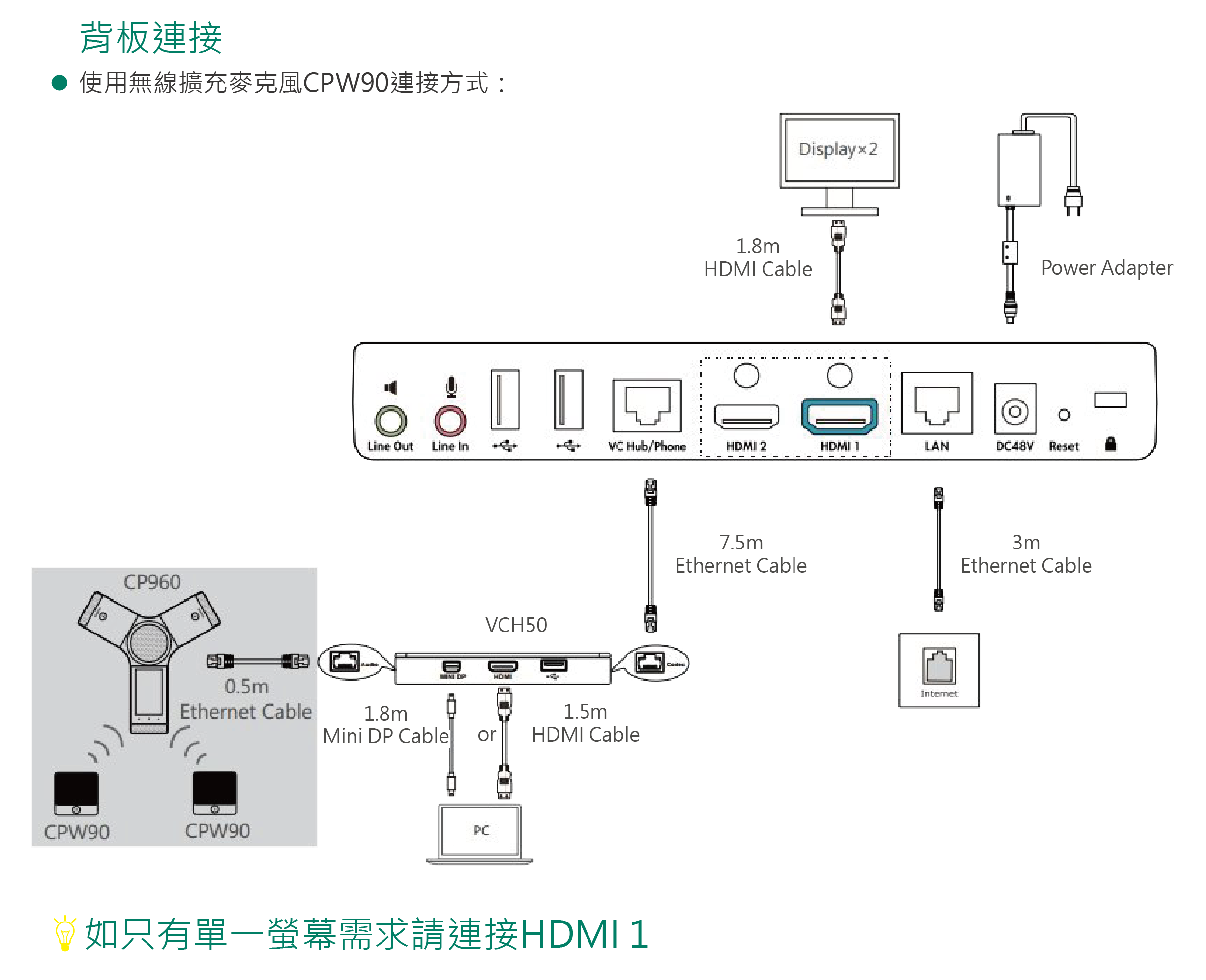 - 1 x Yealink extension port (RJ-45) connect to VCH50/VCM34