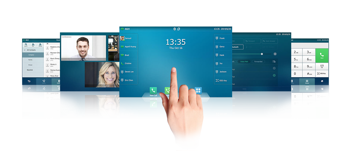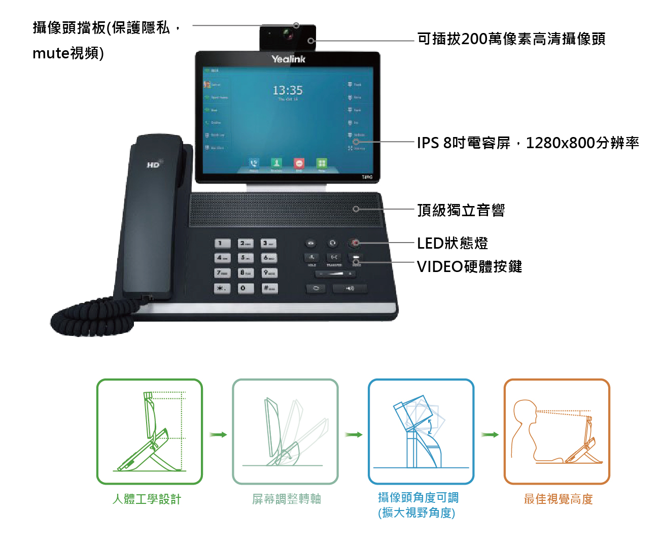 - 8個功能鍵:語音信息,耳麥,靜音,通話保持,通話轉接,視訊,重撥,免持音量調節鍵
